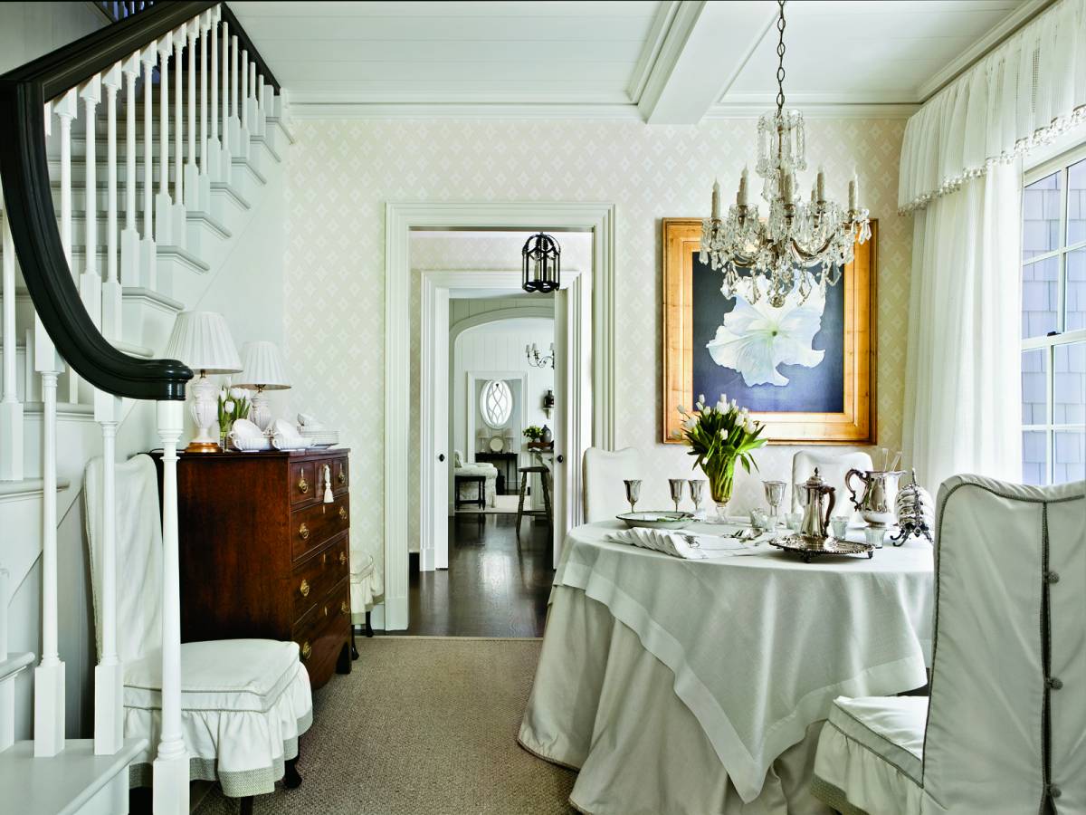 The staircase shares space with the dining room. Putting dining rooms in halls or thoroughfares is genius, in my opinion. That way you are sure to go in it. Whether you eat there or not, at least you enjoy its beauty.
