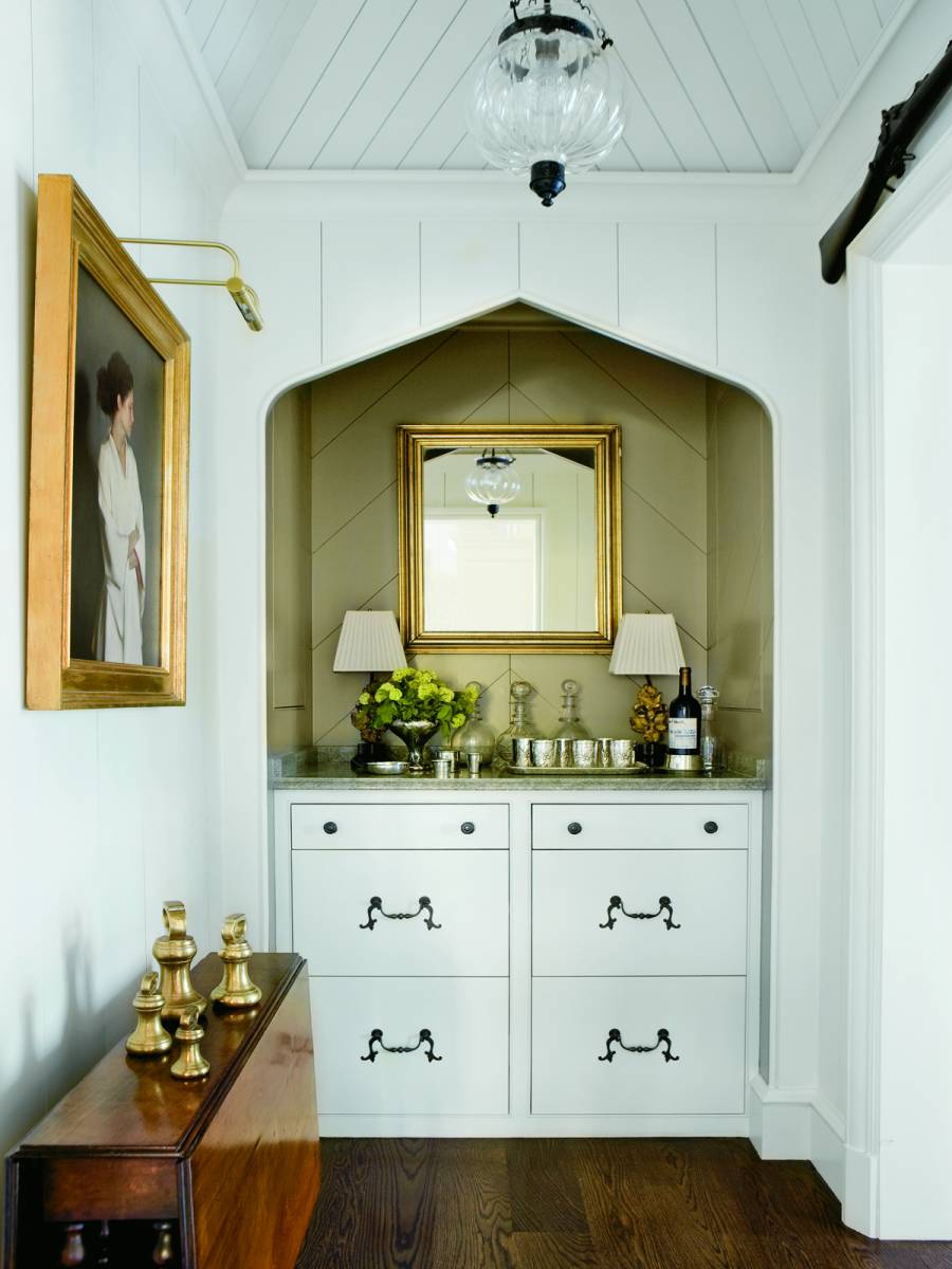 The bead board interior walls and Gothic details of built-ins keep with the cottage feeling.