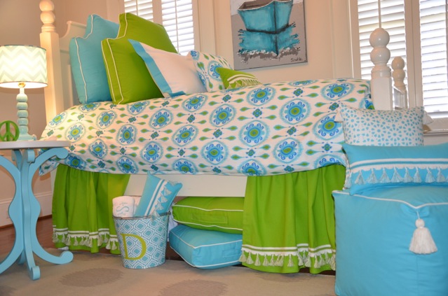 School’s out for summer, but it won’t be long ’til it’s in again and time to decorate your (or your child’s) dorm room or apartment, or maybe you just want to freshen up a bedroom for summer. Oh, and you want a designer look, but not the designer. (No offense to, like, the 85% of my friends who are designers, but we can’t take you EVERYwhere, you know?) Two clever North Carolina gals have started a “luxury dorm brand” called LeighDeux, because both of their names are Leigh. Cute. And so are their designs.