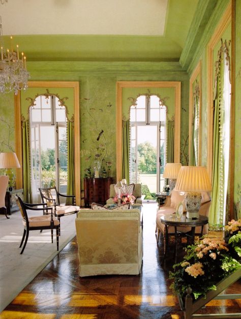 As we say goodbye to the Olympics in London (and well done old chaps!), and pursuant to my modestly athletic post last week on Winfield House, the U.S. ambassador’s residence in London, here is more on its spectacular Green Room, a fabulous room if ever there was. When Hollywood decorator Billy Haines re-modeled Winfield under the auspices of Ambassador Walter Annenberg and his wife Lee ca. 1969, the Green Room was considered his  most significant transformation. At the risk of gushing, I have to say I was transformed by it myself when His Grace and I earlier this summer visited HG’s old Chicago friend and current ambassador to the Court of St. James, Louis Susman and his wife Marjorie.