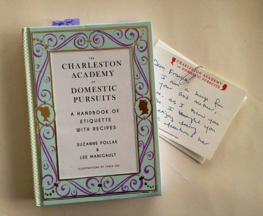 And finally is the fantastic-what-took-them-so-long The Charleston Academy of Domestic Pursuits – A Handbook of Etiquette With Recipes, by Suzanne Pollak and Lee Manigault. We cannot hear enough about How To Do, if only the people who needed to read it would read it. Just sayin’. Anyway it is sophisticated, well-written, fun to read, and right up all our allies. I hope they sell a bazillion copies. Mine arrived with a note from co-author Suzanne, remarking on the inclusion in the book of onion-ring recipe. That alone is worth the  price of the book – seriously.  (Just FYI, here is  Caroline’s fab recipe for Frogmore Stew – a yummy summer supper – I posted a while back)