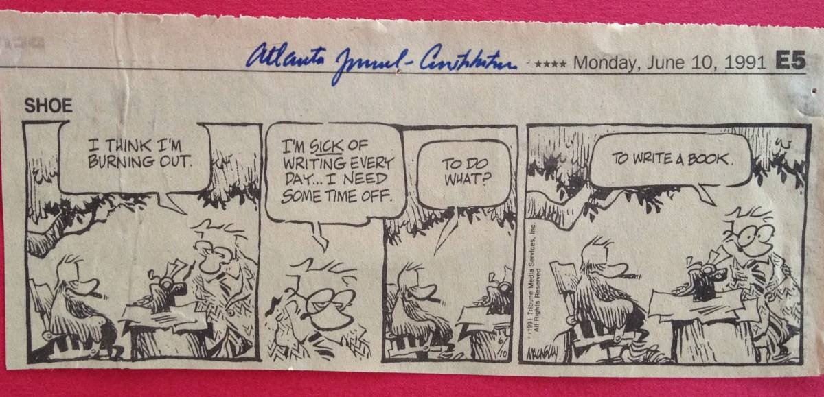 The original title was Just Bee, but they didn’t go for that. Recently my bff Alex Hitz suggested The Bee Cottage Story, which everyone liked. Part personal memoir and part decorating, with lots of photos, the book will be out in July 2015. Lord willin’ and the creek don’t rise.  We are wrangling over the subtitle now. Possibles are: A.  Renovating, Decorating, Living, Learning or B.  How I Made a Muddle of Things and Decorated My Way Back to Happiness or C.  How I Decorated My Way Back to Happiness or D. Renovating and Decorating My Way Back to Happiness What do you think? Which one makes you most want to read the book? Or maybe you have another suggestion? His Grace says it should have “sex” in the title, because sex sells. But I told him it is The Bee Cottage Story, not The Bird and the Bee Cottage Cottage Story. Men, I swear. Can you imagine I saved this comic strip all these years???