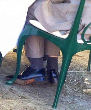 Man sitting with his feet a funny way, in the garden of Le Pigonnet