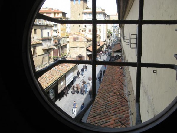 View of the Ponte Vecchio from the Vasari Corridor, where the Medici could look down on the little people. Image via Uffizi.org