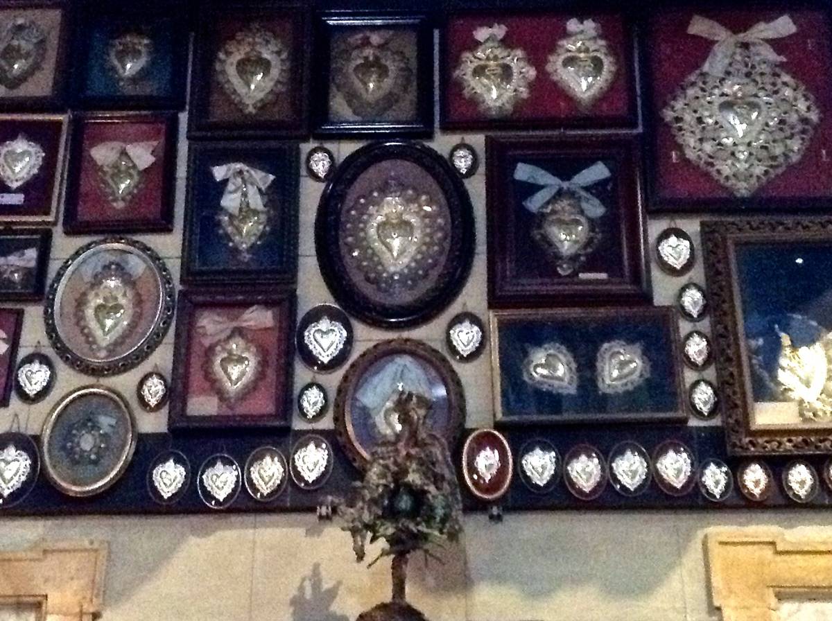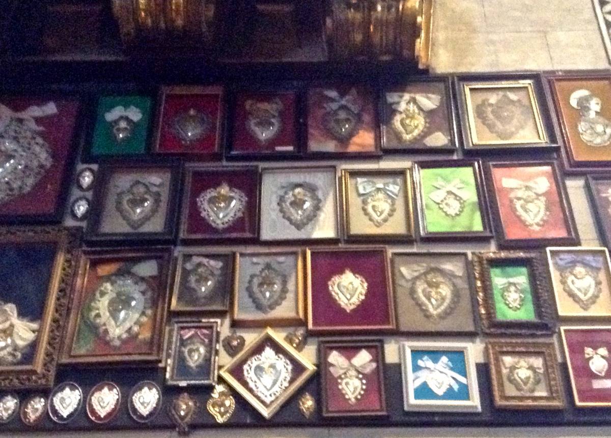 Magpie that I am, I was enthralled by the wall covered in beautiful metal hearts, or ex-votos, thank offerings for answered prayers, or as fulfillment of vows. The winner of the Palio posts one every year, our guide says.