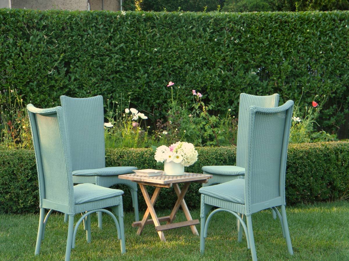 The dining chairs from around the porch table relocate to improvise seating areas in the garden.