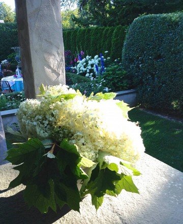 …with a bunch of oak leaf hydrangeas on the table I hope does not collapse by dinner’s end. The flowers and the armillary brighten this darkish corner of the garden.