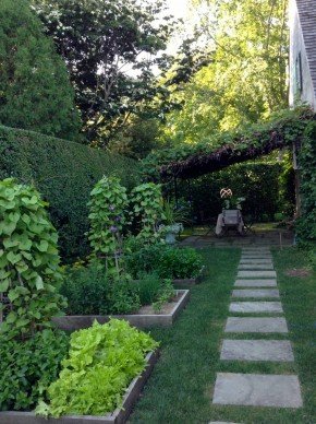 Around to the side, the raised beds and grape arbor remain pretty much as is,…