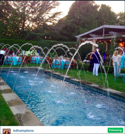 Bee Cottage pool with fountains, photo by Kelli Delaney via her Instagram @kdhamptons