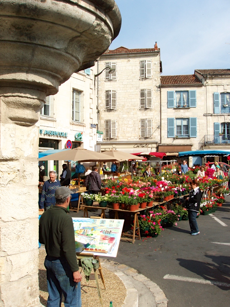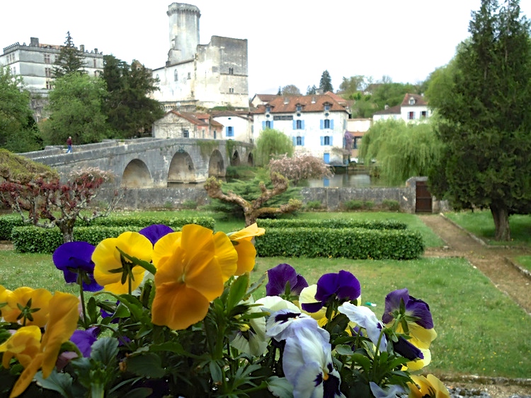 Pansies and a chateau in Bourdeilles, France, near the home of Susan and Tom Vieth.