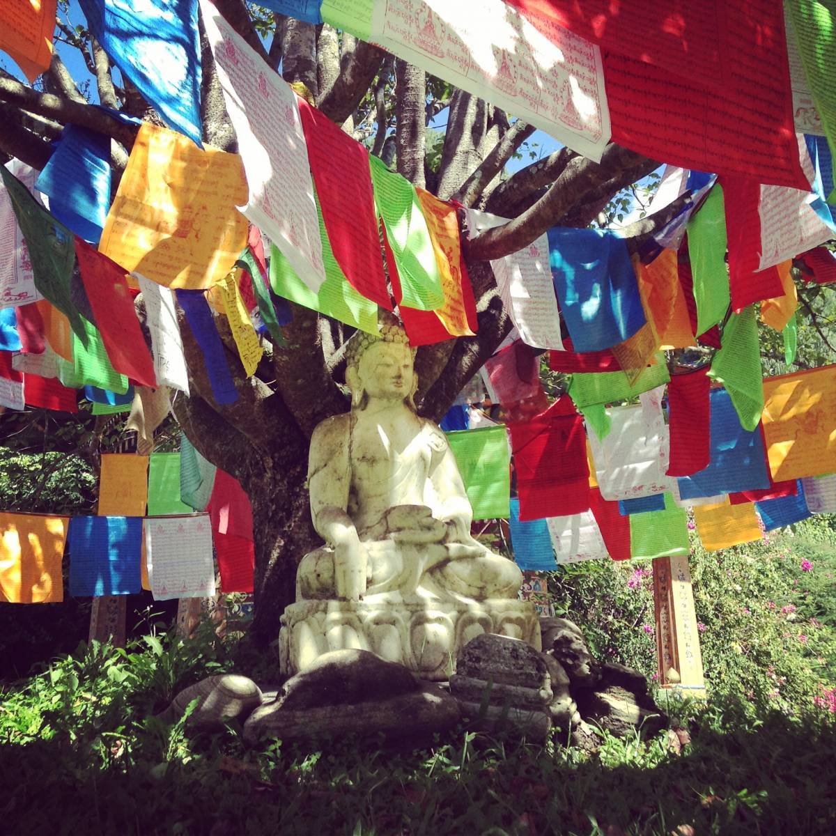 Here is the Buddha sitting under the tree at left with the prayer flags. So beautiful in the dappled sunlight.
