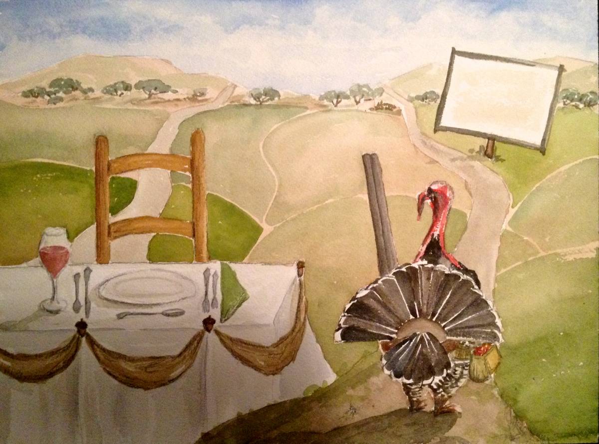 As in past years, I painted a watercolor menu/place card/souvenir. We are a shooting bunch, so last year I keyed off of that. This is ol’ Henry holding a shotgun, with a shell bag around his waist. If turkeys have waists. I don’t have much of a waist myself by the end of the day. Though I don’t have much of one to start with, to tell you the truth.