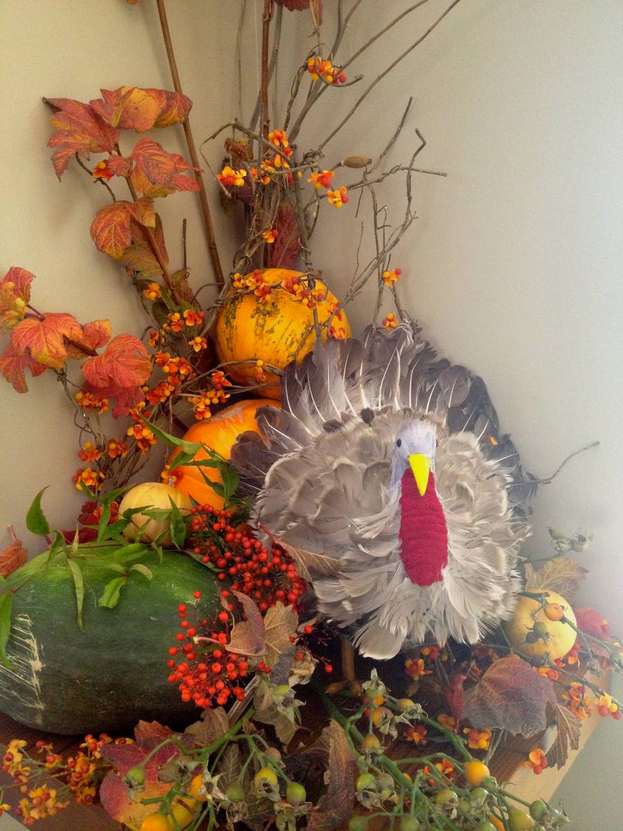 Longtime readers have seen these turkeys before. I got them I know not where on the Internet, never to be heard from again. This is their fourth Thanksgiving, still standing praise be, in opposite corners of our entry hall. This is Horace.