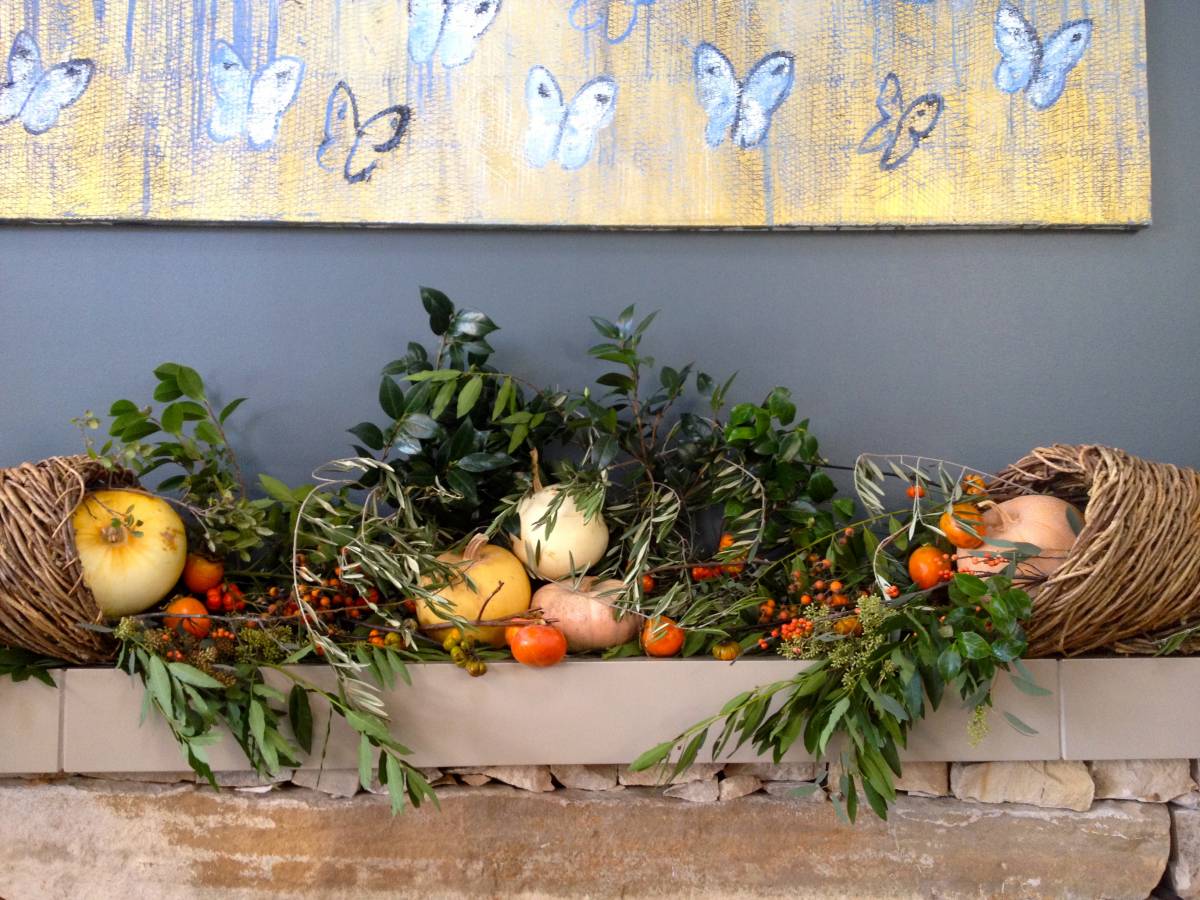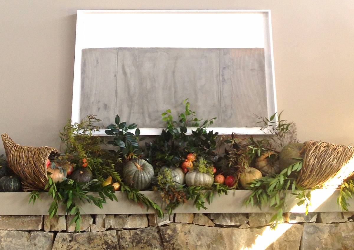 Last year on the mantels I combined dark, glossy green camellia foliage with our California pepper tree, olive, seeded eucalyptus, and bay. Pumpkins and pomegranates add color.