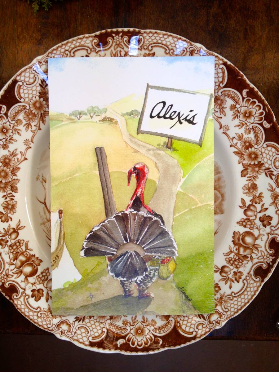 For your very own printable place- or menu card, click here. Drag image to your photos and print on watercolor texture paper. Boom. You can do the vertical version above or a larger, foldable horizontal below. It does dress up your table, and people feel special when they have a specially designated place, don’t you think?  Chef Stephanie Valentine’s beautiful grilled turkey, simply trimmed with rosemary. Sorry I don’t have a download-able version of a grilled turkey.