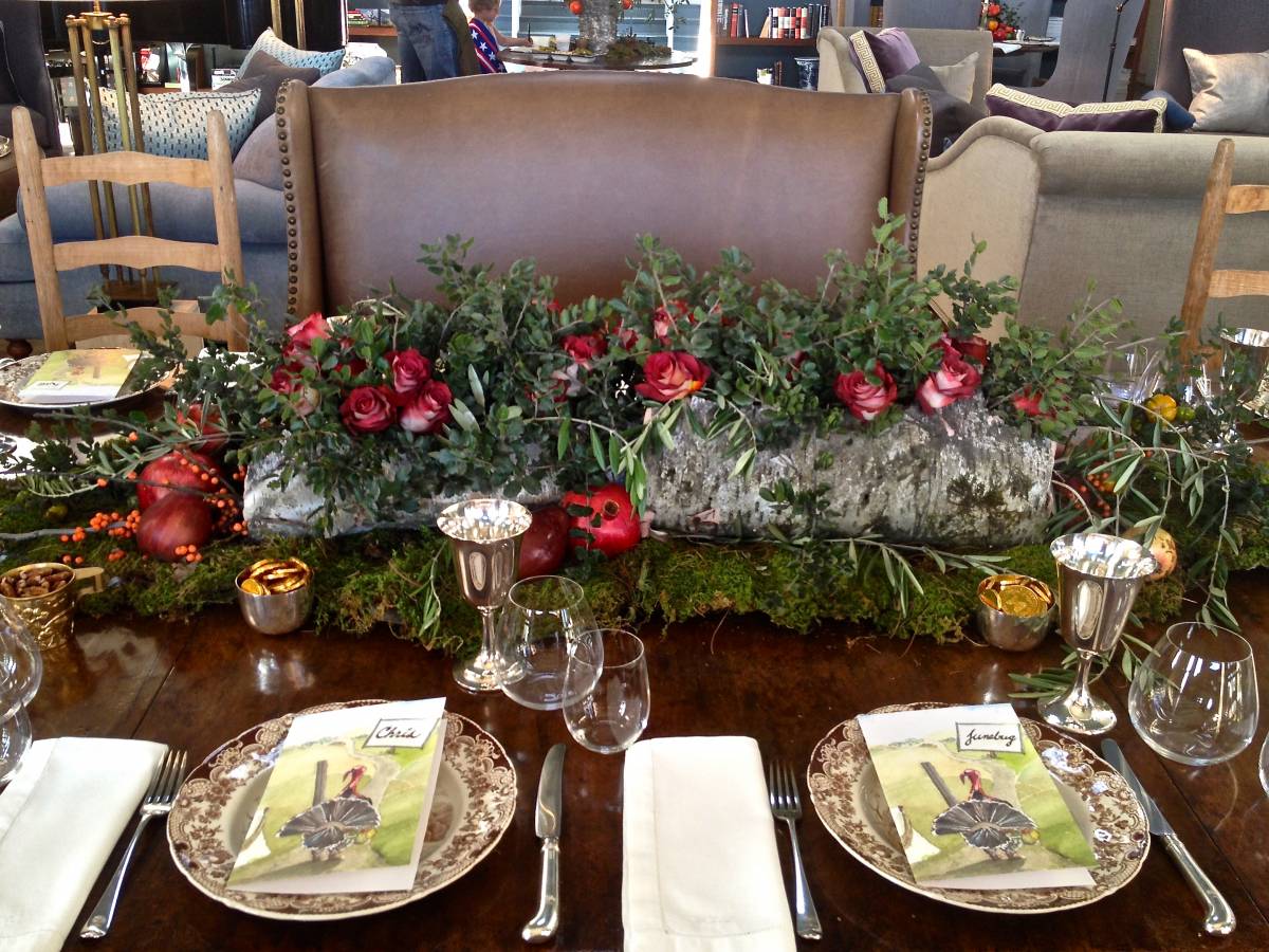 The dinner table with mis-matchy chairs but that’s okay. The centerpieces are birch bark with oak and olive foliage, roses, berries, apples, and pomegranates on a bed of moss. You can order the moss online. There are many sources. The birch bark and flowers come from a wholesaler down the road in Carpenteria (California).