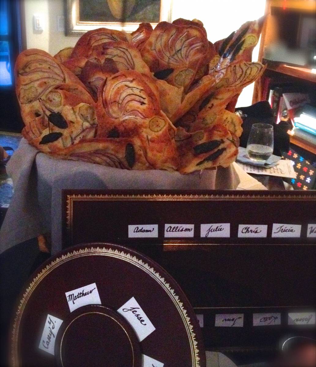 Longtime family friend Julie “Junebug” Williamson, who is also a chef, gifted us with these gorgeous flatbreads. Ohhhhhhh my and they were as good as they looked. Also a nice  way to call attention to the seating plan. I like to put it front and center so you don’t spend the entire cocktail hour unwittingly talking to your dinner partner, JIC you run out of chat. Which even yours truly does on occasion. Hard to believe, I know.