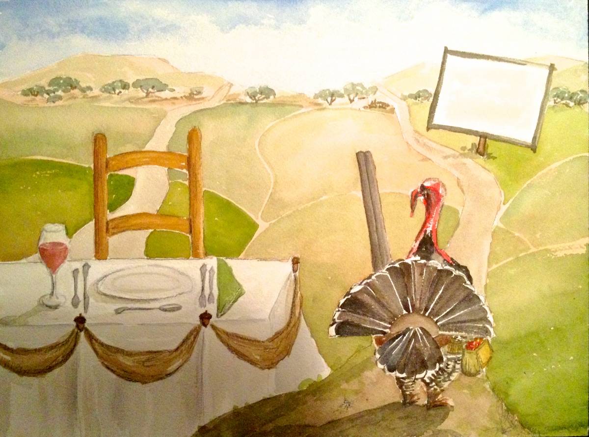Here you go, a a shotgun-toting turkey as printable place card or menu hand painted by moi. Drag the image to your photos, and print on watercolor-textured (or other) paper. It will look like you did it yourself. Wink-wink!