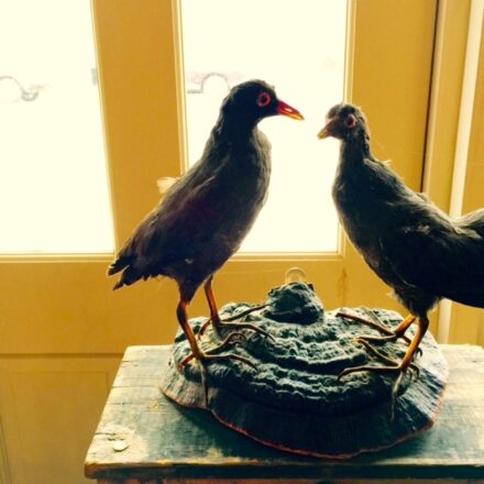 These two look smack in the middle of a conversation. “Does this mount make my beak look fat?”