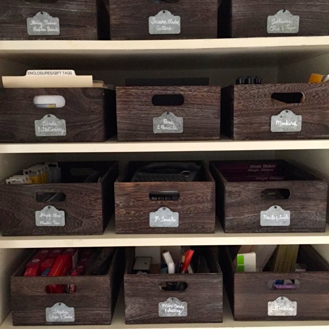 For our office supplies at the ranch, these Container Store bins with zinc tags written on with a chalk marker have made life easier for all of us.