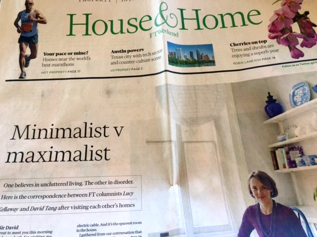 And yet, there are people who want nothing to do with it, and that is okay. They’re not going to buy the book anyway. If you have a minute and want to laugh out loud, read this  April 26 piece in the Financial Times, ”Minimalist v Maximalist,” by FT columnists Lucy Kellaway and David Tang, written in letter form after visiting each other’s houses.