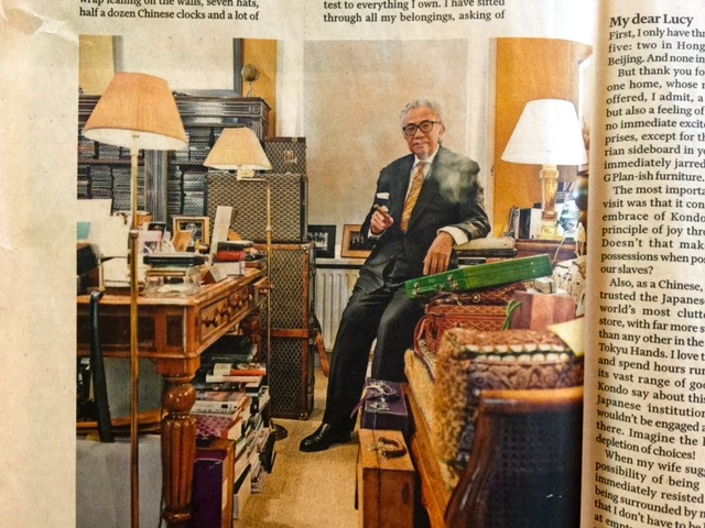 My dear Lucy…First, I only have three more homes…thank you for showing me your own one home, whose manicured tidiness offered, I admit, a sense of calmness but also a feeling of tedium… confirmed to me your embrace of Kondo for her dubious principle of joy through decluttering. Doesn’t that make you a slave to possessions when possessions should be our slaves? … Also, as a Chinese, I have never really trusted the Japanese…Just think of the anti-climax of opening a large drawer only to find…a few rolled-up bundles of your husband’s monochromatic underpants… Stuff the Kondo… Masses of love, Sir Anthony Prise Wing-Cheung Tang, KBE, OBE etc etc