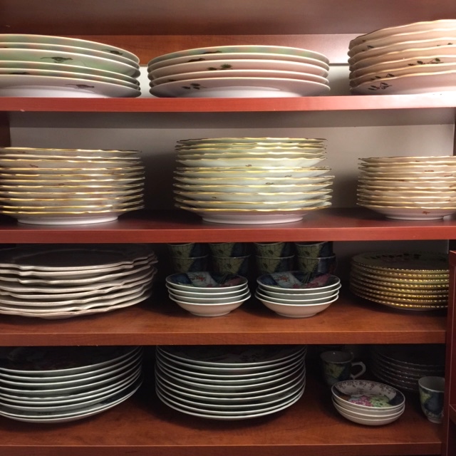 Daughter pointed out that I own 4 dinner services (she thankfully missed some others โ€ฆ ) but to my credit, they are all neatly stacked, loved & used. Luckily she missed my hoard (neatly organised of course) of vintage fabrics โ€ฆ.