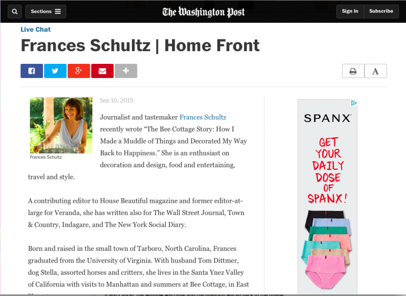 Was just chatting with The Washington Post’s Jura Koncius and readers of her “Home Front,” answering great decorating questions and dispensing my so-called wisdom;) “Home Front” is a weekly jewel of design advice and info. I was happy to discover it, and you will be, too. Link to page here, and a screen shot. With Spanx ad. Ahem.