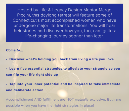 I have worked personally with Life & Legacy Design Mentor Marge Piccini, creator of this conference, and I have much to thank her for in my journey of self discovery and in the pursuit my life’s work and love.