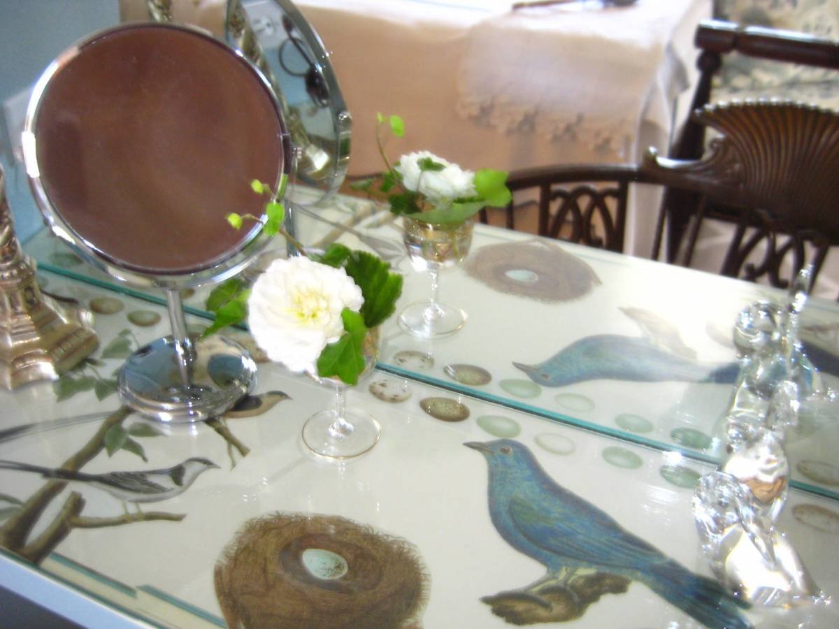 A single bloom in an antique sherry glass (or whatever it is) on my dressing table at Bee Cottage. Under the glass is a homemade collage done with illustrations cut from a calendar.
