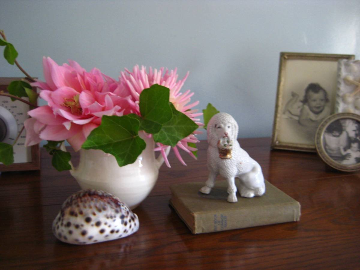 A sugar bowl with dahlias and ivy, a shell, and a Coalport figurine compose a simple vignette on a dresser at Bee Cottage, my house in East Hampton. (That's my baby picture in the background. My hair looks like Puck's, in Glee.)
