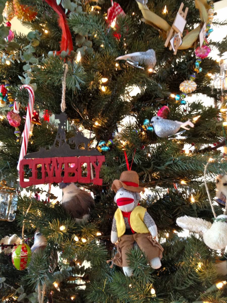 Well the cowboy thought thought all those ornaments were ridiculous, except of course for the one that said COWBOY, but he was a good sport. He even hung candy canes on top of the ornaments, which he thought was really ridiculous. But you have to have candy canes. Plus they were 4 boxes for $5 at the CVS. Ho!