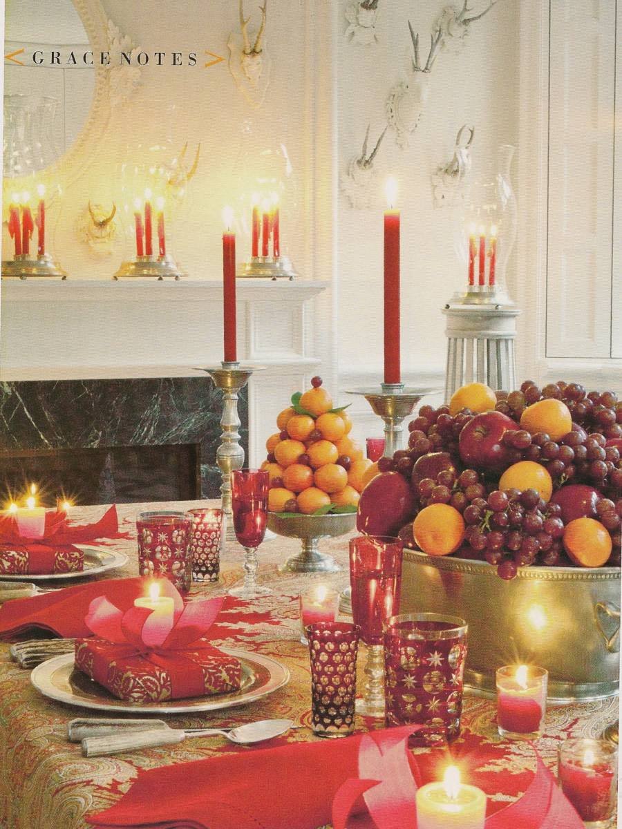 But we all have the grocery store, and that’s about all you need to re-create this beautiful look: apples, grapes, and clementines. They’d be just as beautiful in a tureen, a basket, or a simple platter. The red candles are festive and sexy at the same time. And anyone can wrap a little present and put a votive candle on it. Red napkins? Easy enough on the Internet. Do you have a fabric store near you? Hunt down a beautiful paisley challis or damask for the table. You don’t even have to sew it. Just drape it over and call it a day–once it is all set no one will notice. Or maybe you have a beautiful old quilt you could use as a tablecloth or a shawl as a runner.