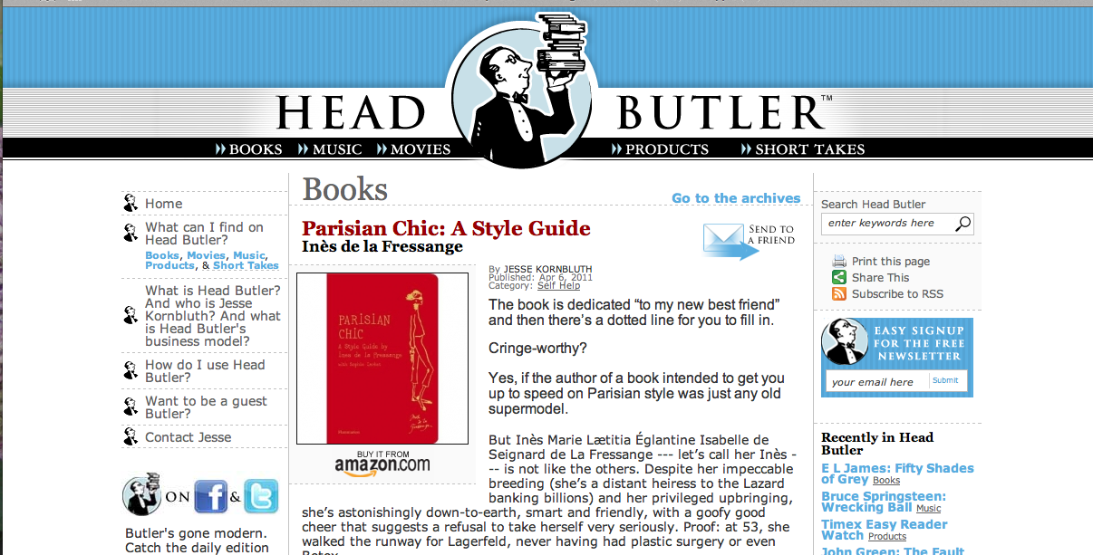 Now do yourself a favor and sign up for Jesse’s blog, Head Butler.com. It is a revelation. Like reading Vanity Fair from cover to cover without actually having to. He also writes for Vanity Fair, btw. Minus the million-word celebrity profiles, Head Butler is a go-to source and highly discerning arbiter of popular culture, telling you which books, films, music and so forth are really worth it. We are all, as he says, drowning in media, and his blog is just the life raft I was looking for.