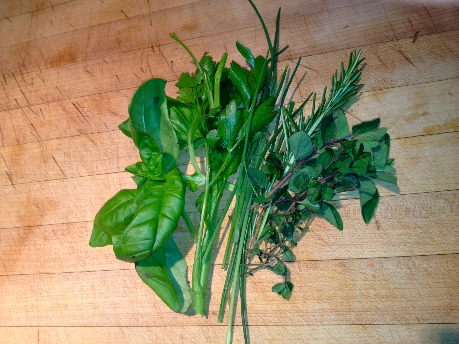 Steph used a combination of basil, parsley, chives, rosemary, and large-leaf thyme, but you can experiment.