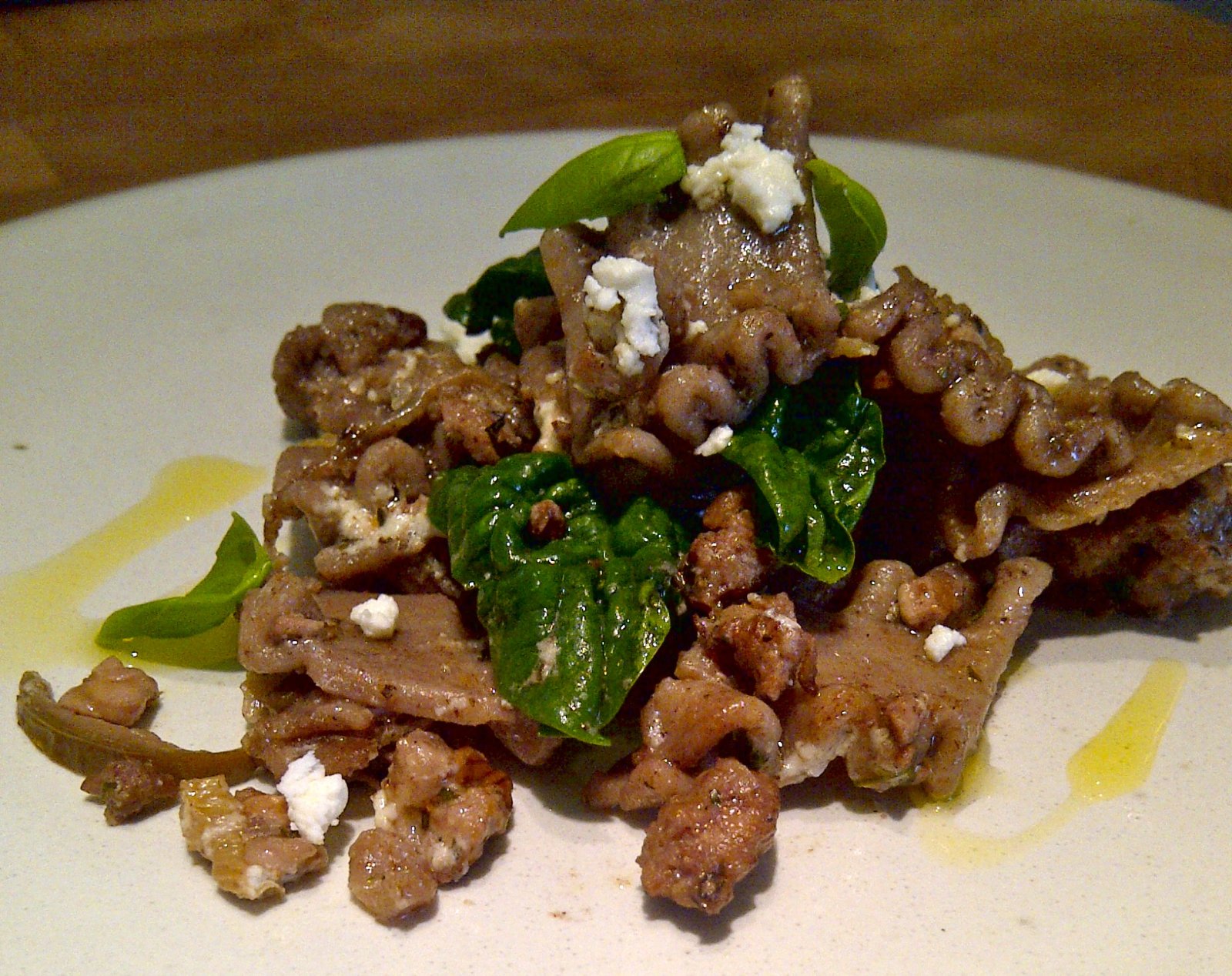 It’s a smokey-sweet-savory mixture of sausage, caramelized onion and fennel, asparagus, artichoke hearts, spinach, olives, a hint of crushed walnuts and golden raisins, feta cheese and a squeeze of lemon juice. “Who would think of this?” my Cowboy might say though usually in reference to politicians, not pasta.