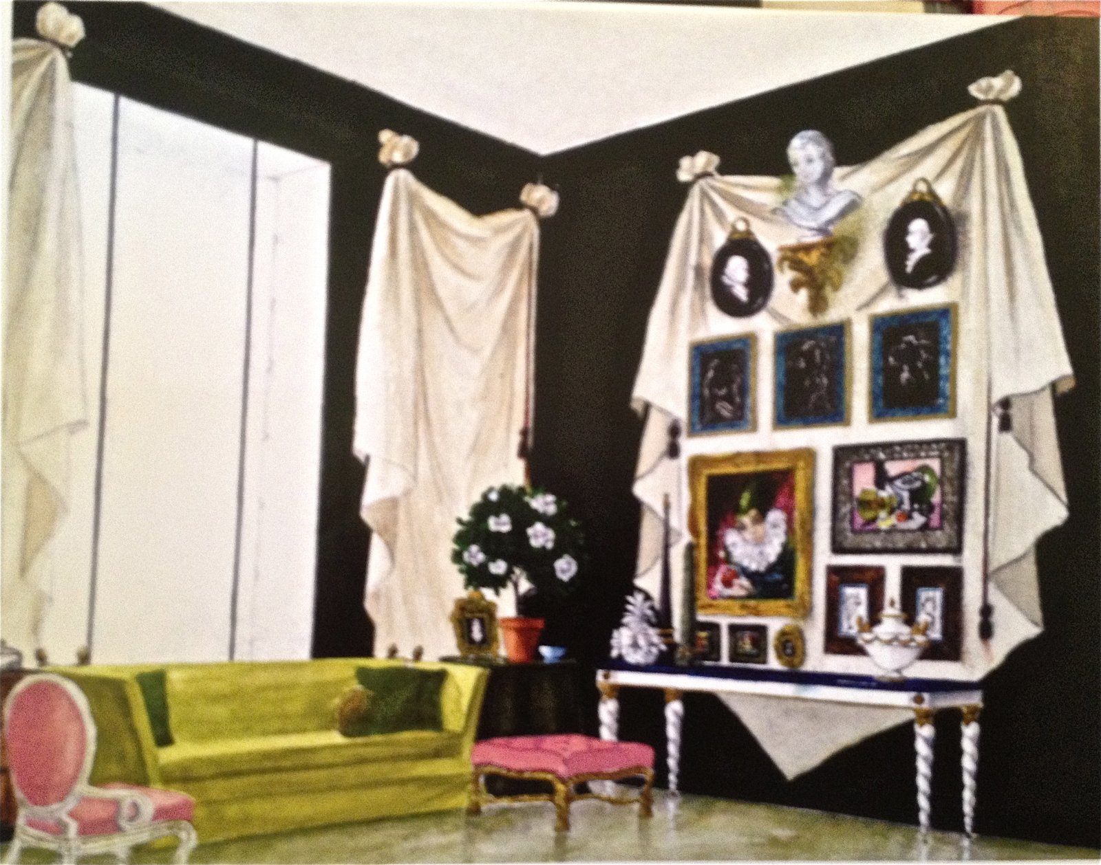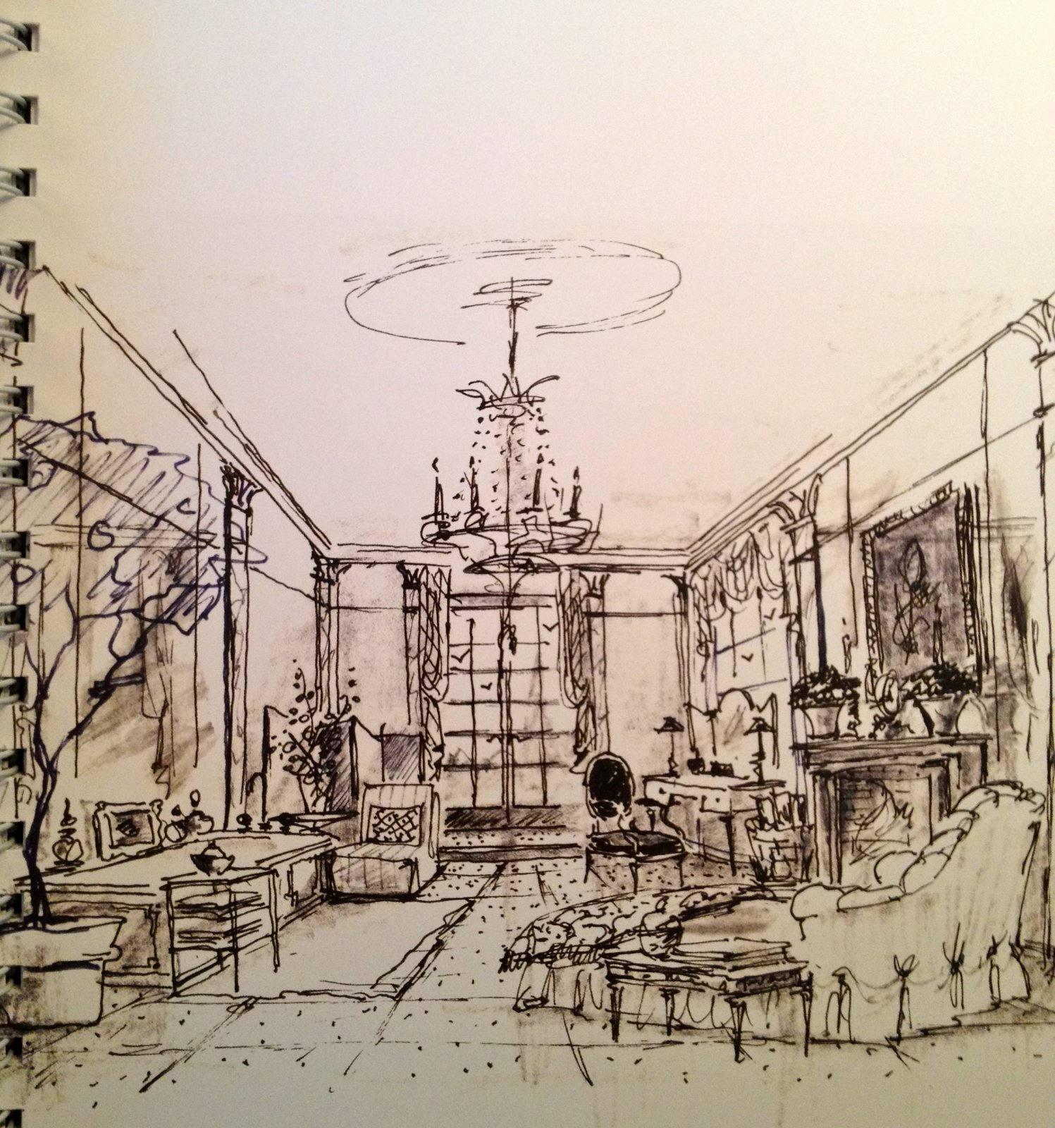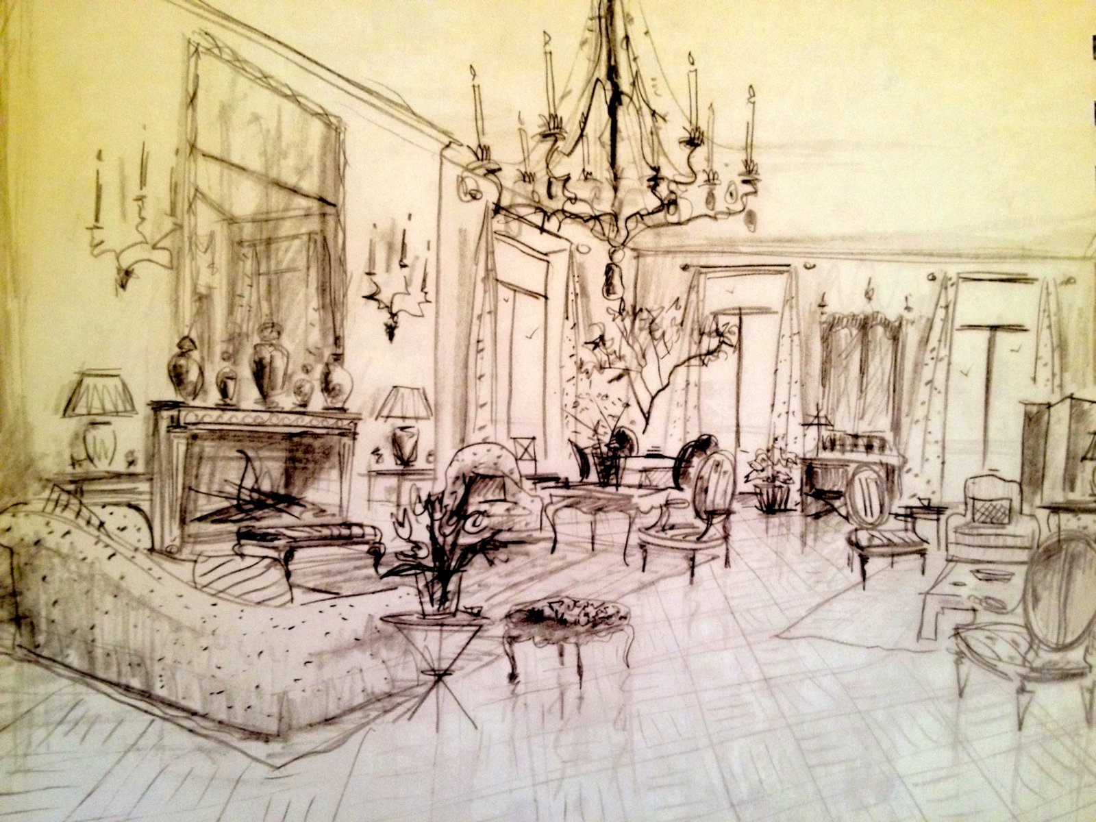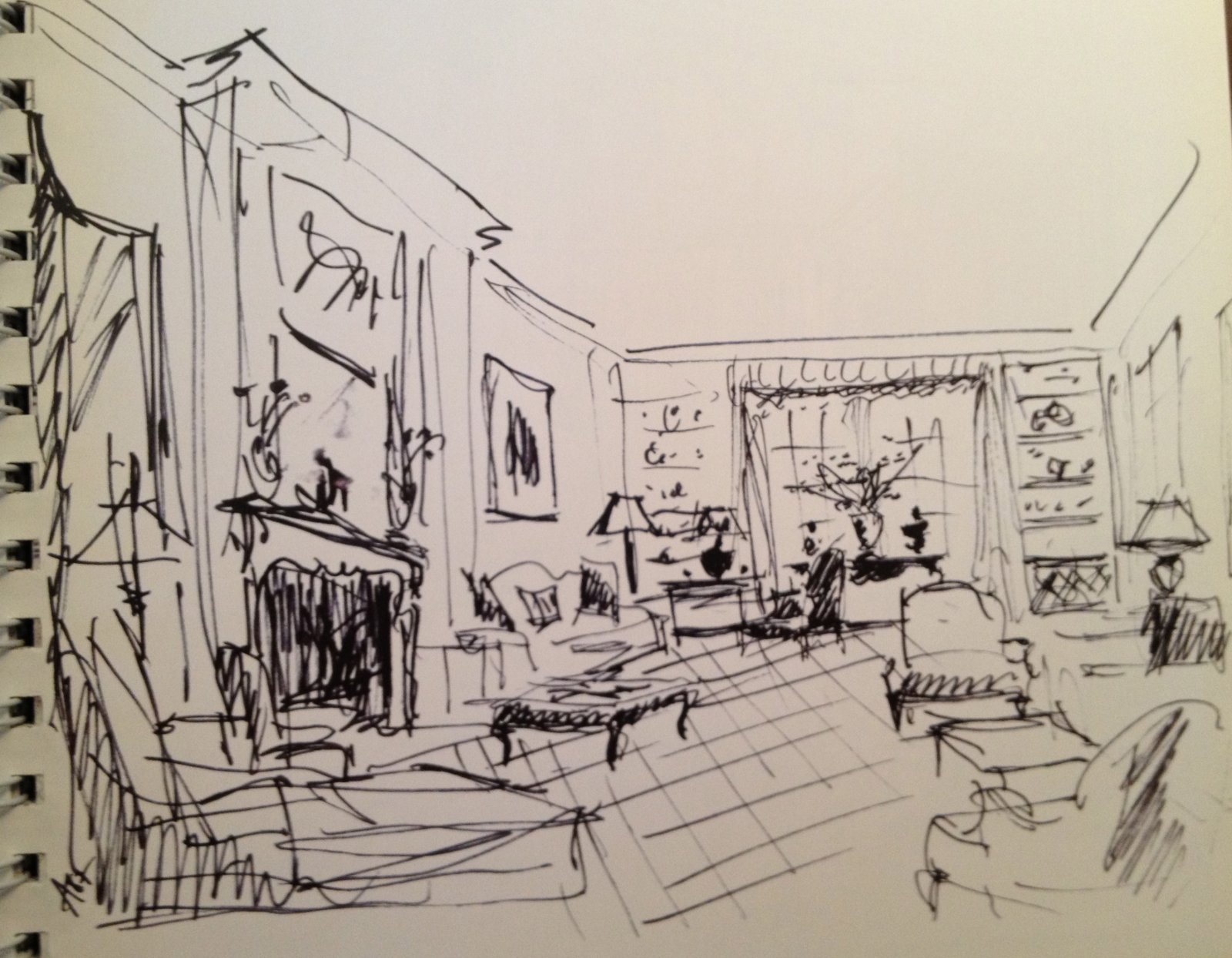 So when I look at what a room needs, I think about the composition: high-low, dark-light, soft-hard, modern-traditional, “legs”-skirts. For me a room needs all these elements to work. It never occurred to me to try to sketch a room in order to work it out, and I’m not sure I’d be so good at it. But as a part of the design process, thanks to Mr. Hadley, I see how excitingly useful it can be.