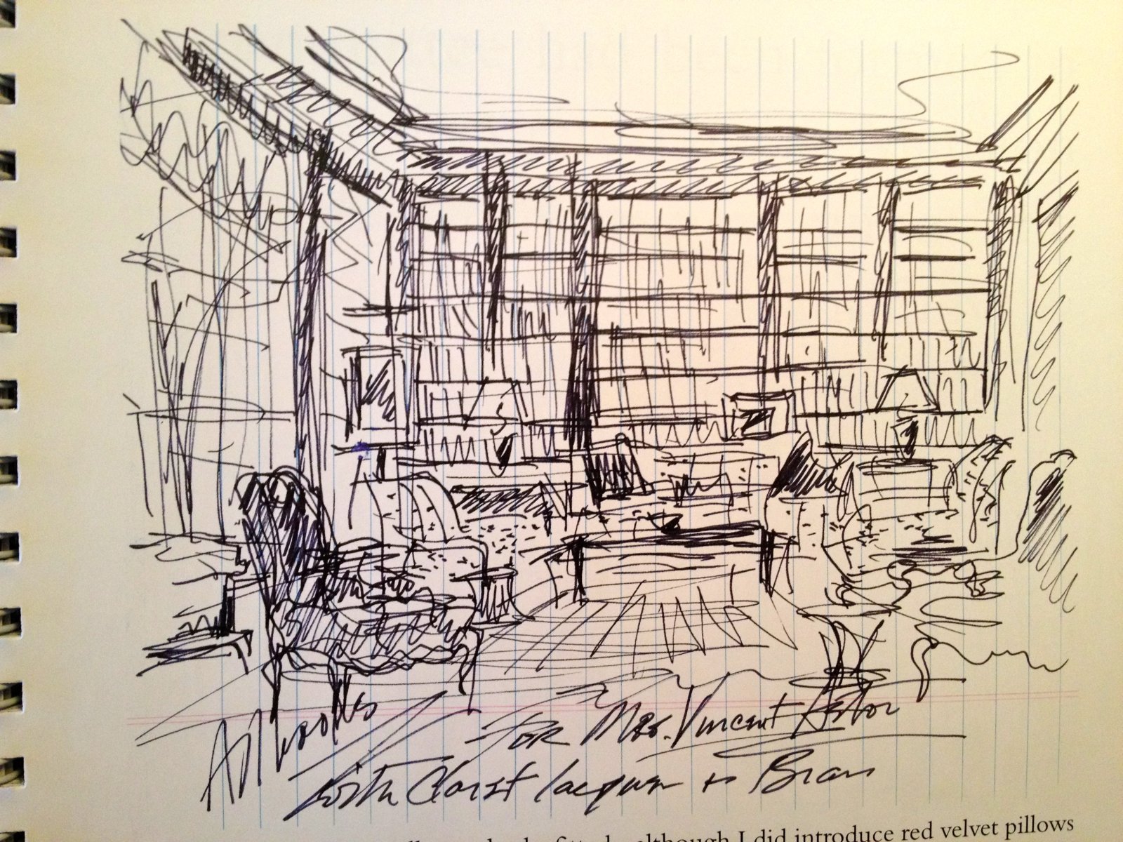 “Some people make lists,” he says in the 2004 book Albert Hadley – Drawings and the Design Process, “I sketch.” Once I’ve defined the concept with a sketch, my imagination is set free to investigate the various possibilities. He explains that he makes the sketches for himself, sometimes up to 20 for one room, and that the client may never see them.