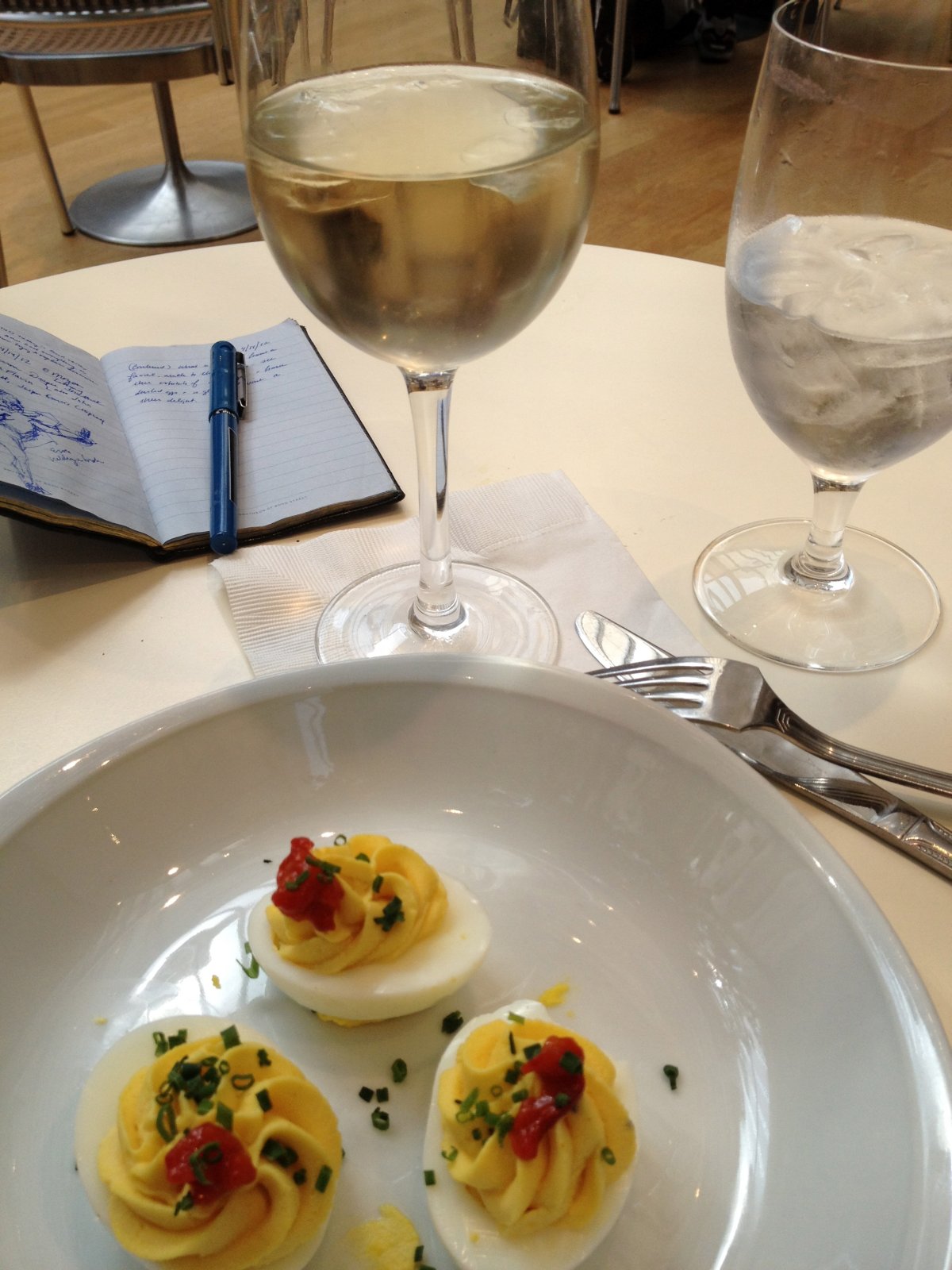 Last Saturday was the most beautiful day in New York, and I treated myself to the wonderful drawings on exhibit at the Morgan Library. And then I sat in the Renzo Piano-designed atrium to have a bite. And there they were on the menu: deviled eggs. Like an (ironic) angel sent them. Just the perfect thing. Even had a glass of wine and a coffee afterward. It felt like the biggest splurge – and vaguely French, somehow, sitting at the little table in the indoor-outdoor cafe watching the people go by. I grew a beret. I said merci to the waiter.