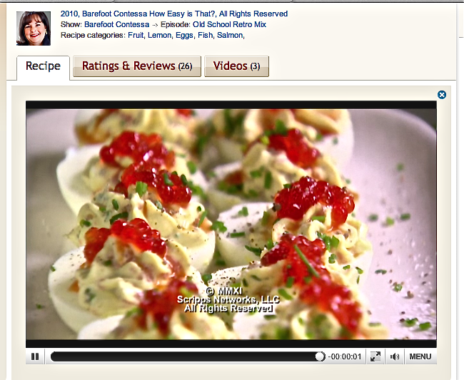 I haven’t tried Rachel’s yet, but I have tried Ina Garten’s with smoked salmon and salmon caviar on top, and they are yum de la yum (French). Here’s a 5-minute video of Ina making her smoked salmon deviled eggs, including a primer on how to boil them properly. Spoiler alert: place in pan and cover with cold water. Bring to boil. Turn off and let stand for 5 minutes. Then rinse and immerse in cold water for 2 minutes. Boom.