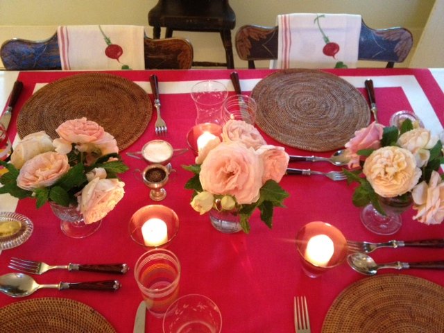 Roses from the garden and a mixture of silver and crystal, with clear votives for sparkle, set a  simply beautiful table. (2) Note the three small bouquets instead of a single centerpiece. (3) The tablecloth doesn’t quite cover the ends and so what. (4) Napkins draped over the chair backs are a stylish gesture, and it keeps the small table from becoming cluttered. (5) Are those tea towels posing as napkins? There’s another fun idea. (6) Napkins could be a number of things–tea towels, cotton scarves, bandanas, vintage linen hand towels…