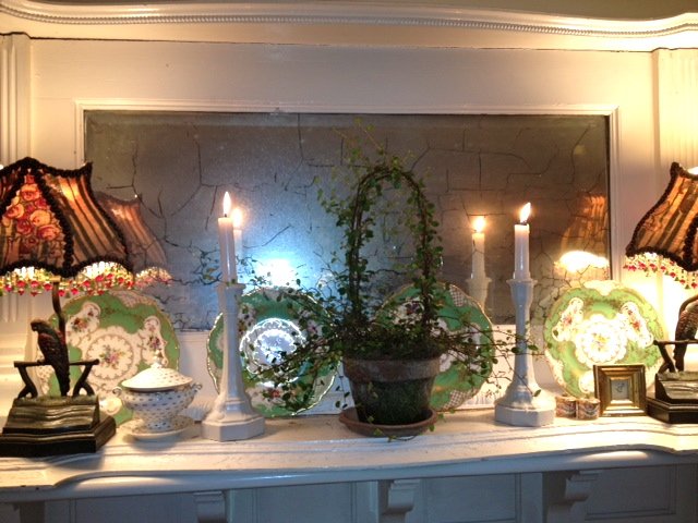 Valerie's mantle is a pleasing vignette of topiary, candlesticks, and china. The antique lamps are a nice touch.