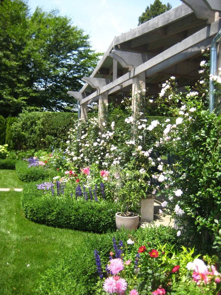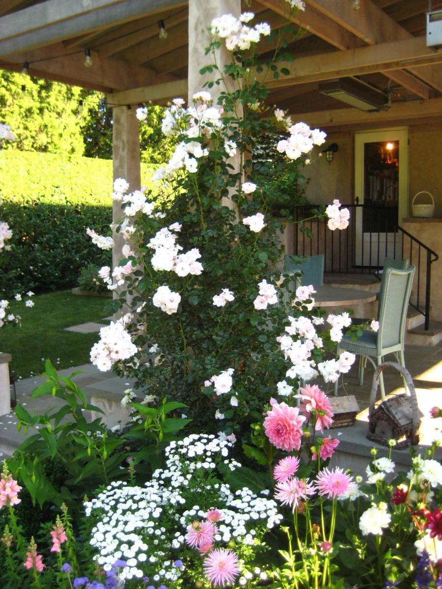 This is the roses’ second summer, and we’re training them up the columns. By next year they should reach the beams, and oh boy that will be beautiful. Gardening is not for the impatient. That is the joy and the madness of it. (Woops I see some bad-hair-day privet there in the back. Gardening isn’t for the overly uptight, either; even though I sort of am… sometimes… about my garden.)