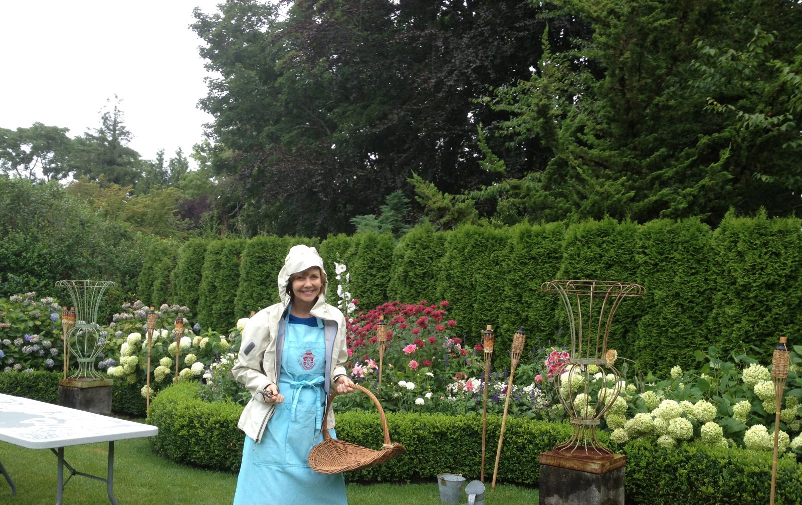 After a very long day at the office, I love getting home, opening my email and finding new posts from you and Hollye. Food for the soul. Don’t you look tres chic in your rainy day duds! Little White Riding Hood, Red’s gardening sister. Am putting that bed and the witch’s hat pavilion on my Wish List. Thanks for the laughter!