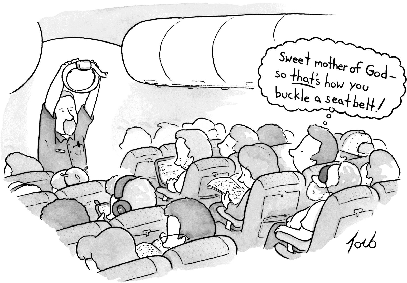 I do wonder why airlines still have to explain the buckling business, though, don’t you? Isn’t there something insidious, if not outright silly, about the adherence to a rule whose practical application has expired? I mean, how do they think people get to the airport? Roller skate?