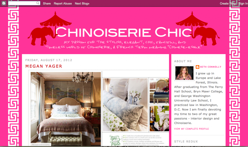 Well she is too bragging and well she should. Dede’s daughter Megan Yager lives in Texas now but works all over, and Dede keeps me up on her. Megan’s been on our House Beautiful radar for a while now, as has her Mama. Dede wrote to share with me this link to the Chinoiserie Chic blog, which I love, and which recently featured Megan’s work. With our 72 houseguests this weekend I don’t know how I missed it… Thank you, Dede! And let’s say the apple doesn’t fall far from the tree. Here’s a bite: