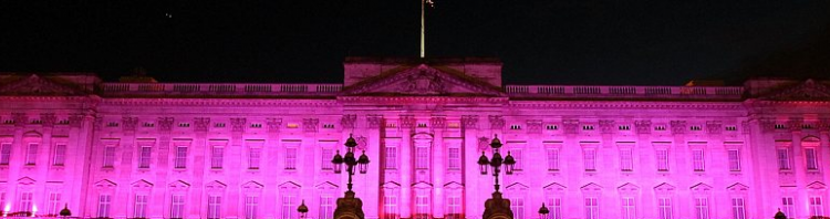 Buckingham Palace in the Pink, via Getty Images, Daily Mail Online. Other London landmarks are lit in pink as well.