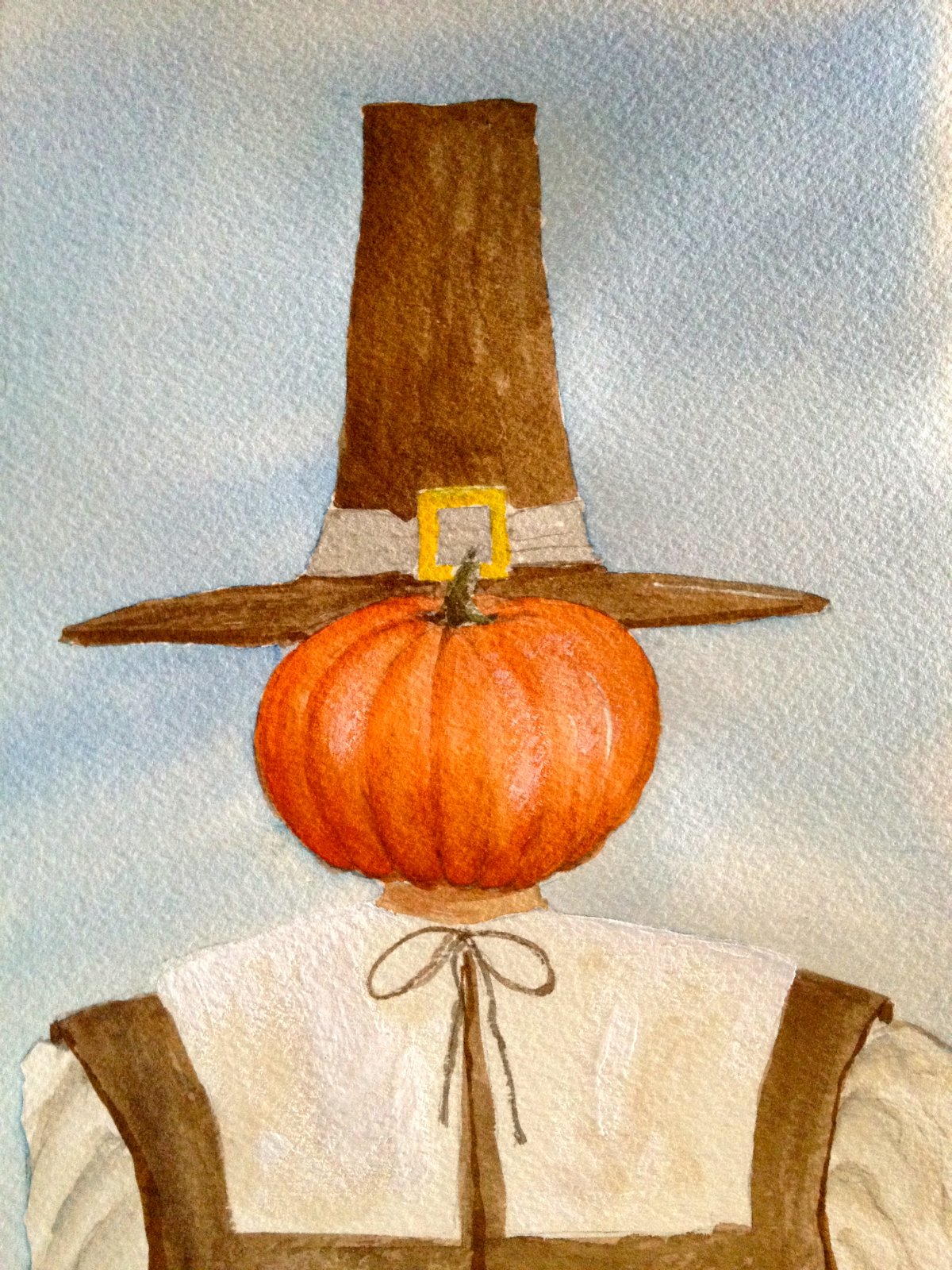 With apologies to "Man in the Bowler Hat" artist Rene Magritte, my version in pilgrim form. These will be our place cards, with the names lettered on the collar at bottom right, like an 18th-century nametag.
