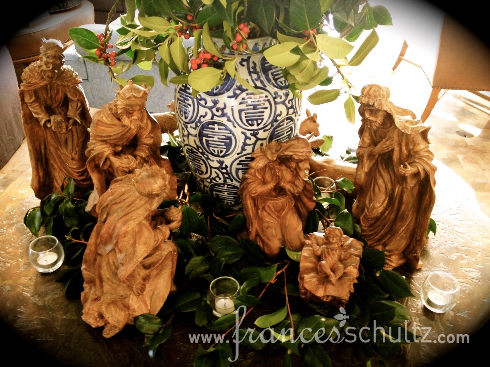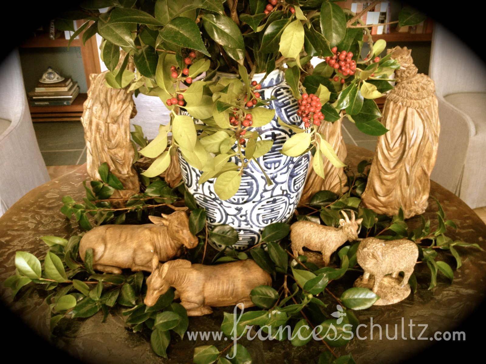 19. Frances,the way you arranged the creche is wonderful. Especially crazy about the mix of camellia leaves and holly. Noticed that camellia was used in the pictures of arrangements at the wedding. You do inspire !!