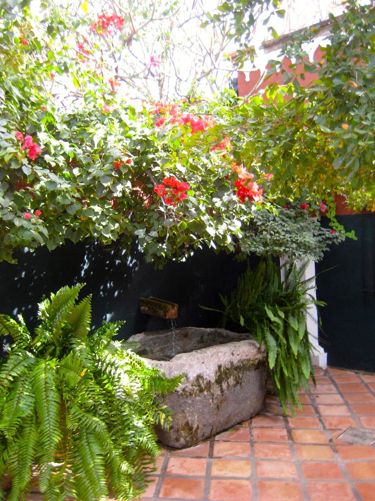 Like many of the old houses here, a rather stern street-side facade opens to the lovely surprise of sun-splashed courtyard and gurgling fountain.